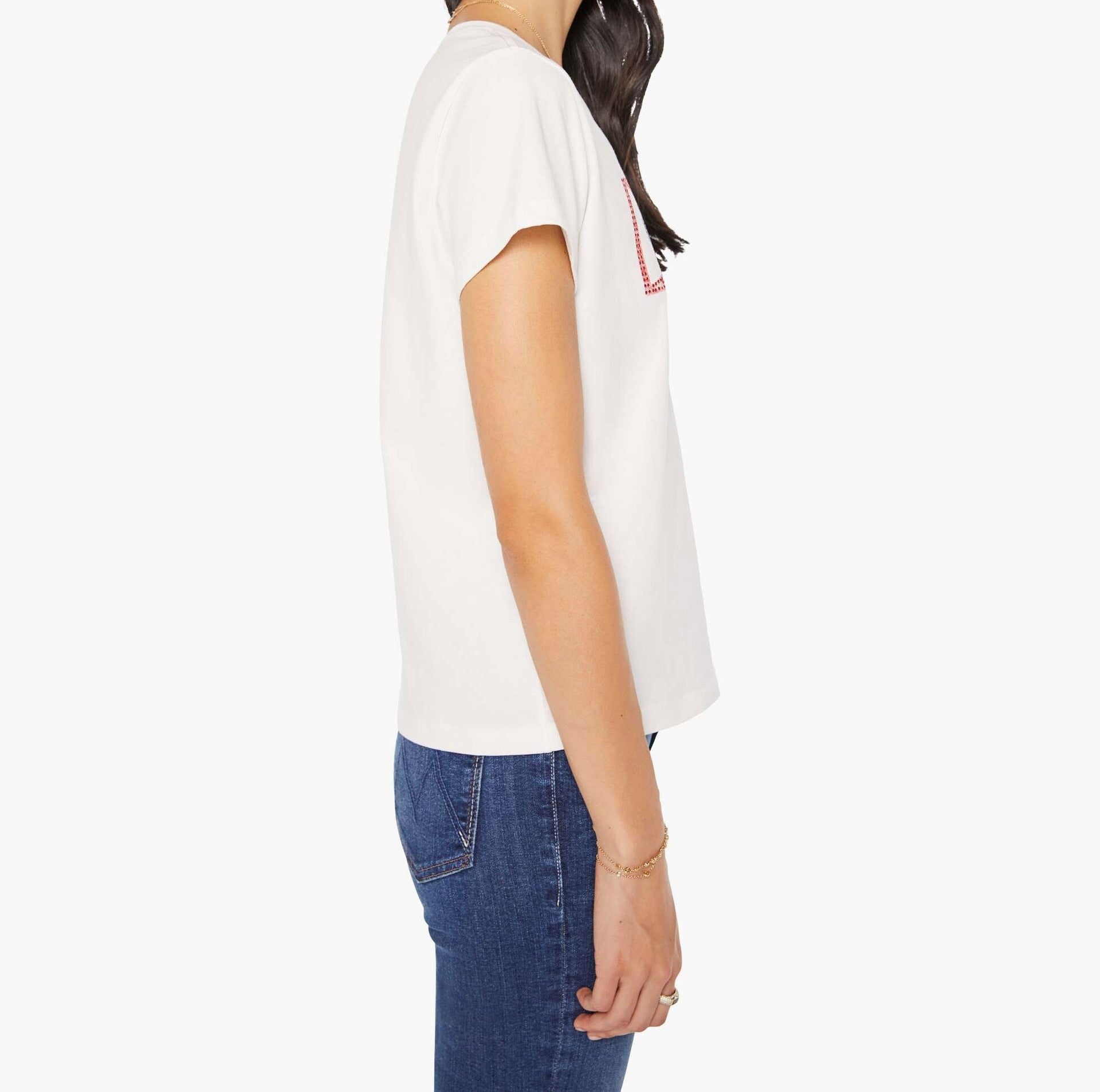 Catch me if you can. A soft crewneck with a slim fit for a vintage look and feel. Made from 100% cotton in white, The Boxy Goodie Goodie in Fast As A MOTHER features a faded red and blue graphic embellished with metallic rhinestones and MOTHER across the front.