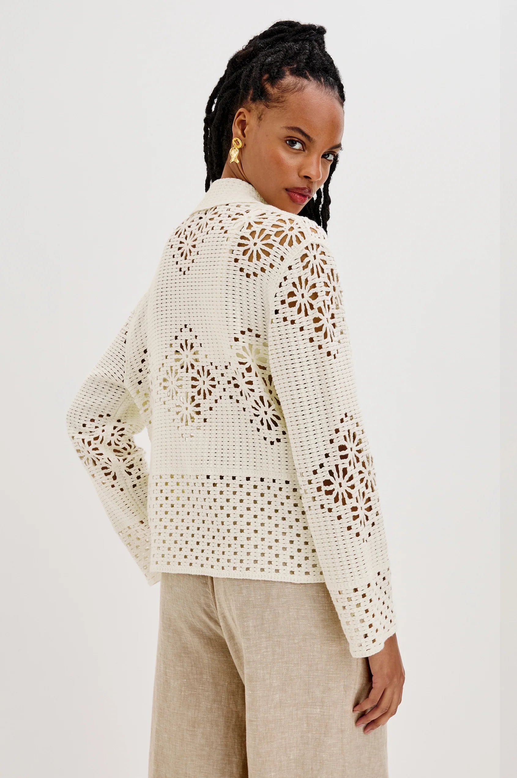 The Patmos is a button-up knit featuring eyelet details and natural shell buttons. Made in a soft cotton crochet that's ideal for a breezy beach day or paired with jeans.