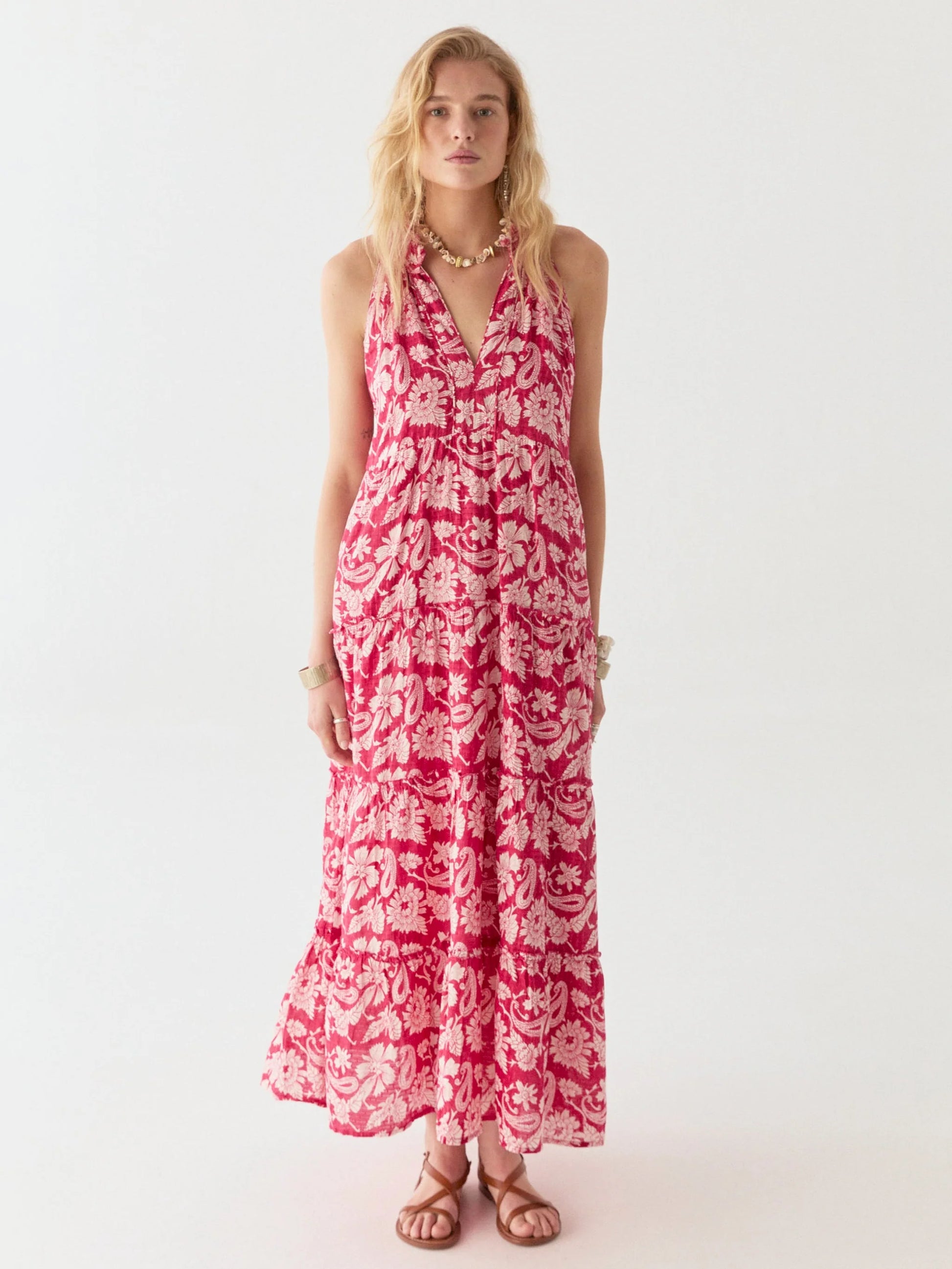 Cut in soft cotton, Jade is pure island energy—light, easy, and made to move. The halter neckline keeps it playful, the open back adds just enough boldness, and the tiered hem sways with every step.