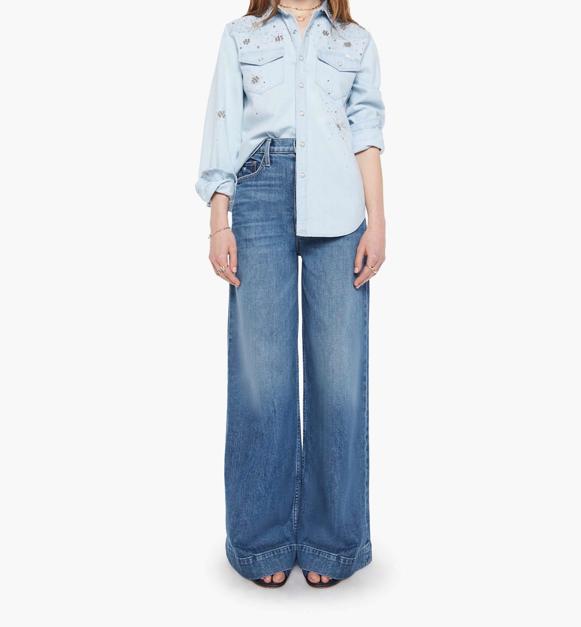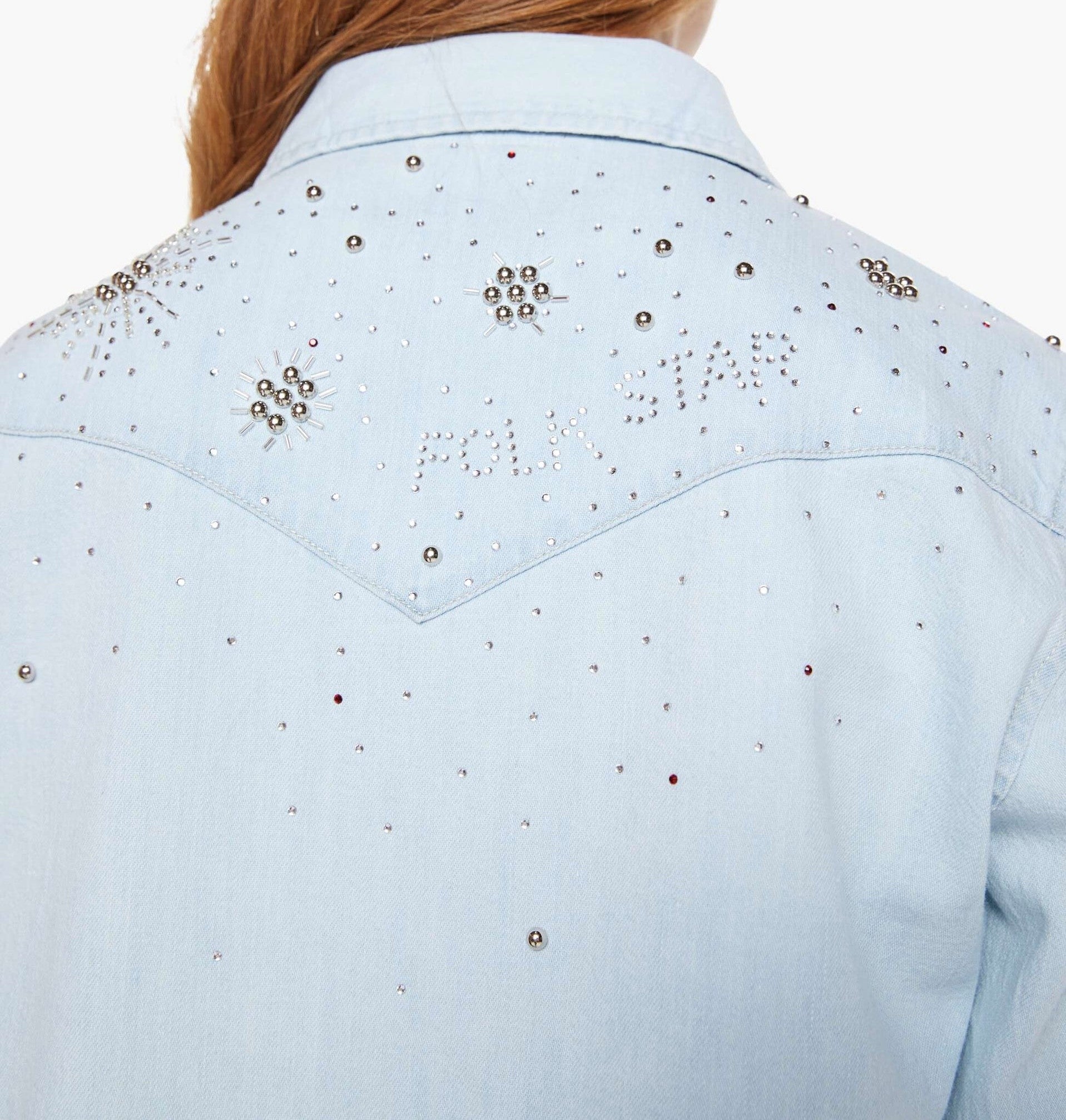 Never enough. A Western-inspired denim button-up with front patch pockets and a curved hem. Made from 100% cotton, More Is More is a faded light blue with faux pearl snaps down the front and beaded details with rhinestones across the shoulders and chest.