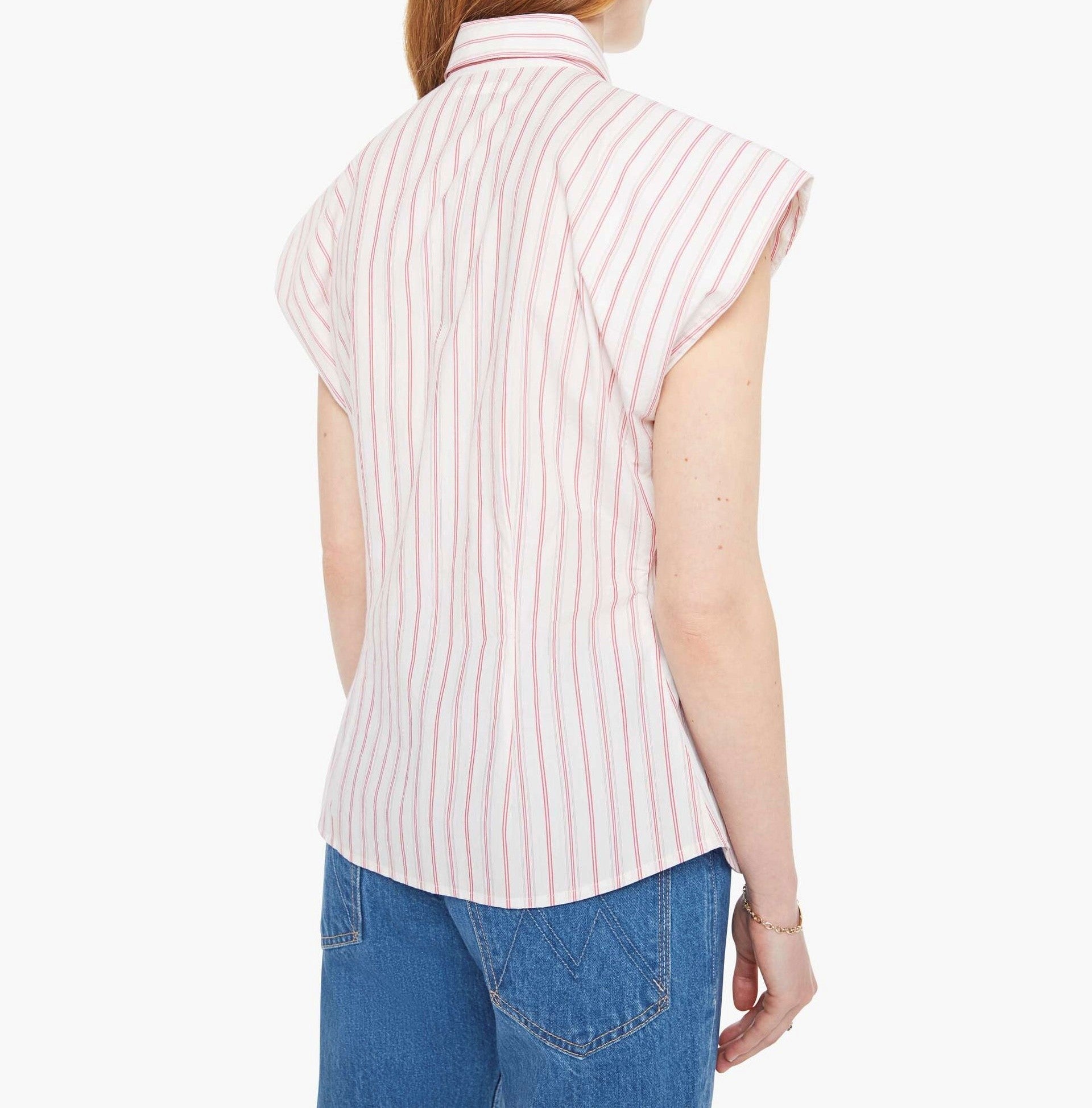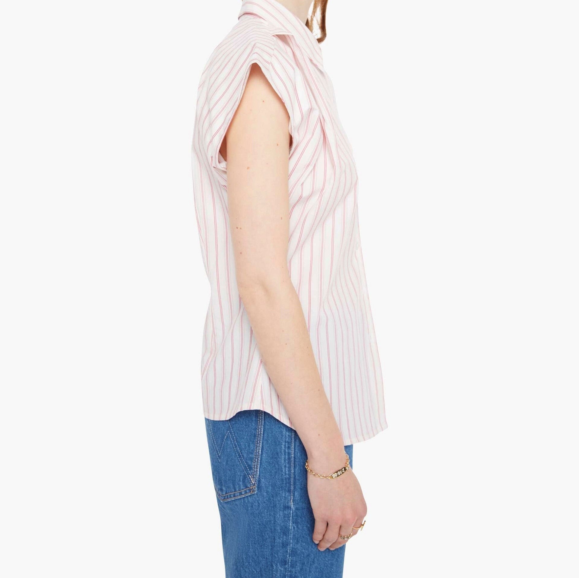 Cross the line. A short-sleeve button-up with an angled bodice and a curved hem. Made from 100% cotton, Line Breaker is a white and light pink stripe pattern.